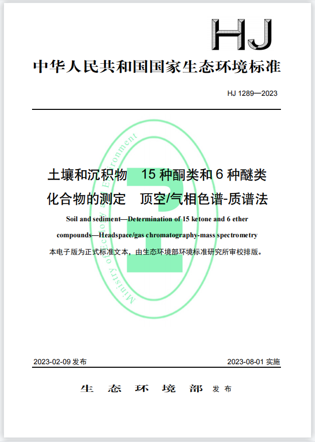 土壤和沉積物 15種酮類和6種醚類化合物的測(cè)定 頂空-氣相色譜-質(zhì)譜法 (HJ 1289—2023) 更新日期:2023-08-02 下載包(1)